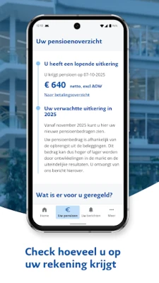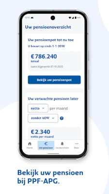 For deg som ennå ikke har trukket deg tilbake fra arbeidslivet, presenterer appen en detaljert fremstilling av din opptjente pensjon og gir deg et estimat for hvordan din fremtidige pensjon vil se ut under det nye pensjonssystemet. Dette gir deg verdifull innsikt for å ta informerte beslutninger om din fremtid. Er du allerede pensjonist, tilbyr "PPF APG pensioenapp" deg full oversikt over dine utbetalinger; du kan enkelt se nøyaktige datoer for når pensjonen din blir utbetalt, samt hvilke beløp du kan forvente på din konto.